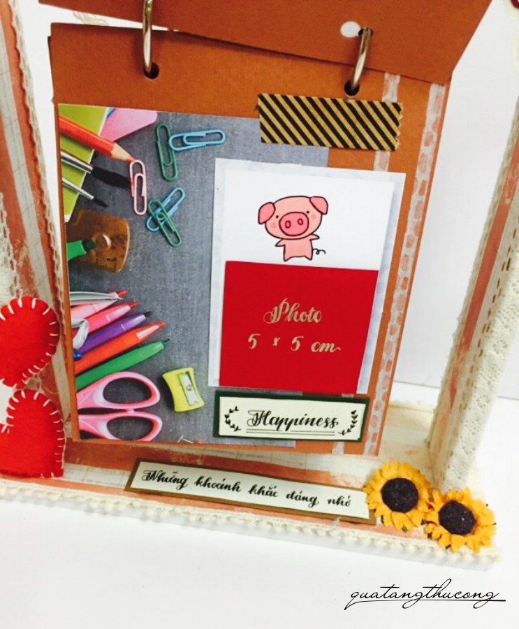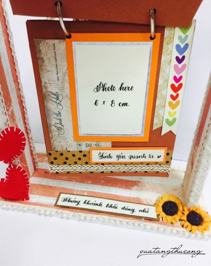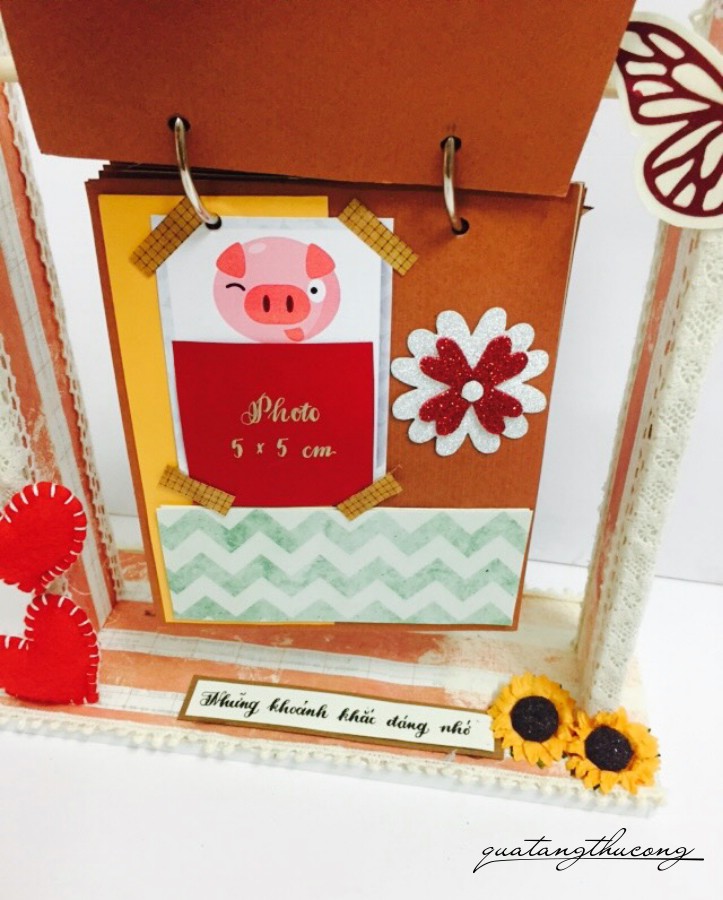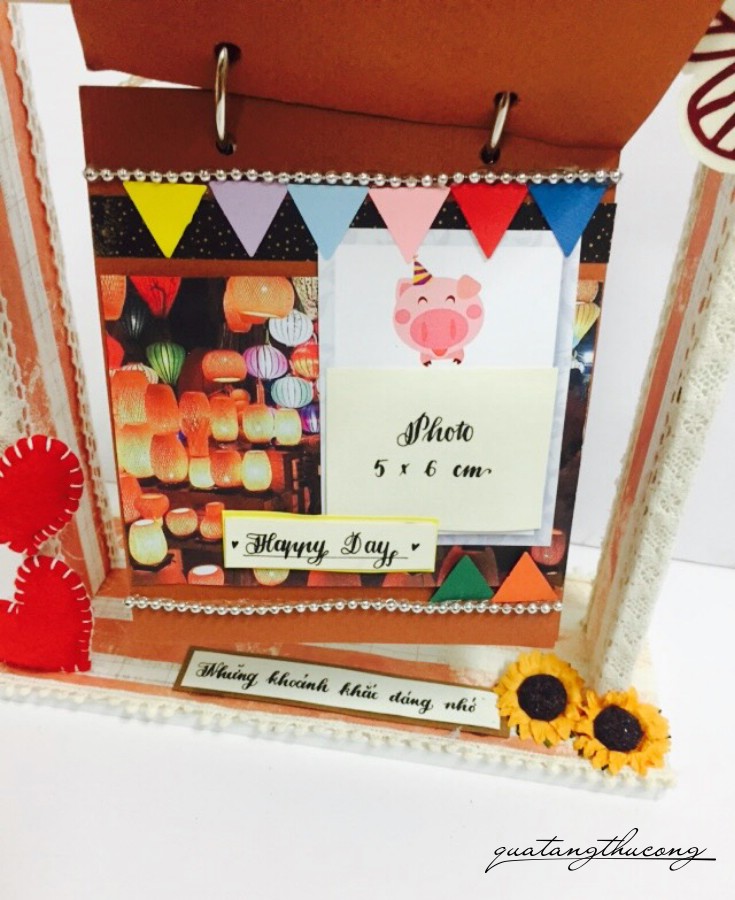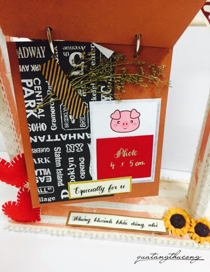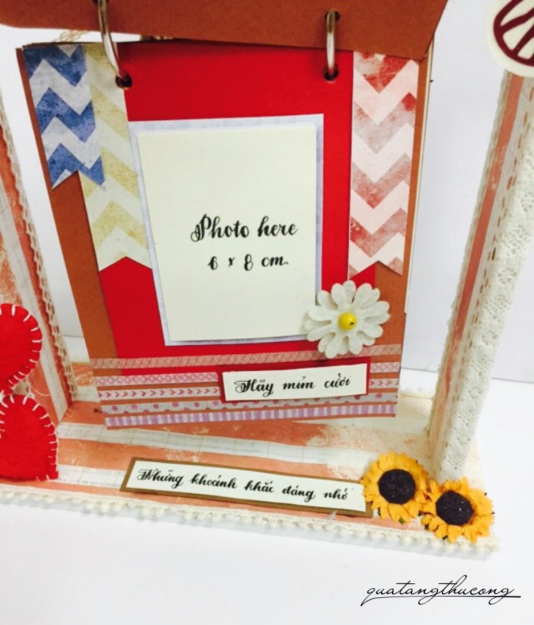 Album có 12 trang được trang trí khác nhau để dán hình với các loại giấy mỹ thuật, giấy scrapbook cao cấp, origami, ruy băng,..., Vinacraft có chú thích kích thước ở khung dán hình như 4x5cm, 4x6cm, 5x5cm, 5x6cm, 5x7cm, 6x8cm,... rất đa dạng.
