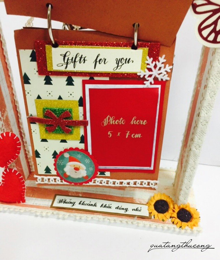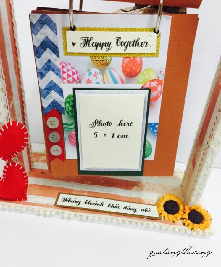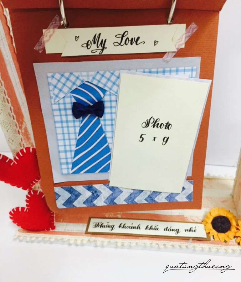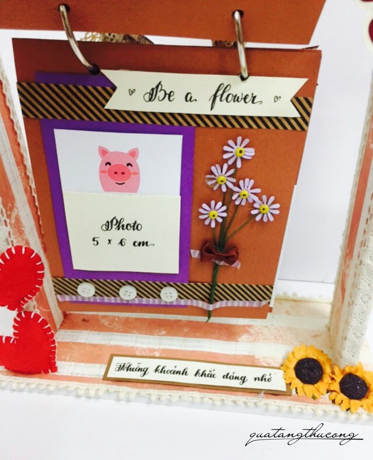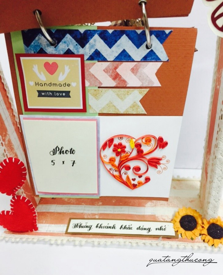 Album có 12 trang được trang trí khác nhau để dán hình với các loại giấy mỹ thuật, giấy scrapbook cao cấp, origami, ruy băng,..., Vinacraft có chú thích kích thước ở khung dán hình như 4x5cm, 4x6cm, 5x5cm, 5x6cm, 5x7cm, 6x8cm,... rất đa dạng.