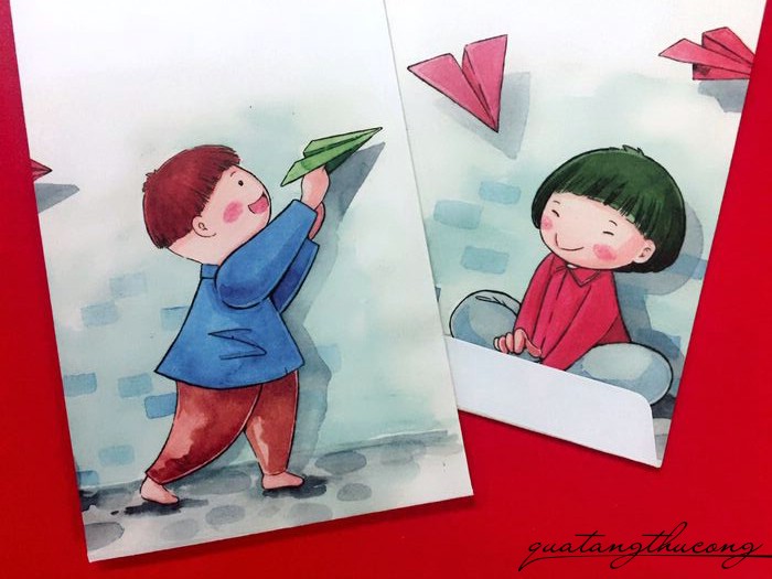 Nó được chị họa sỹ nick Thanh xinh vẽ bằng chất liệu màu nước, sau đó được in ấn tạo thành những chiếc bao lì xì xinh xắn thế này.
