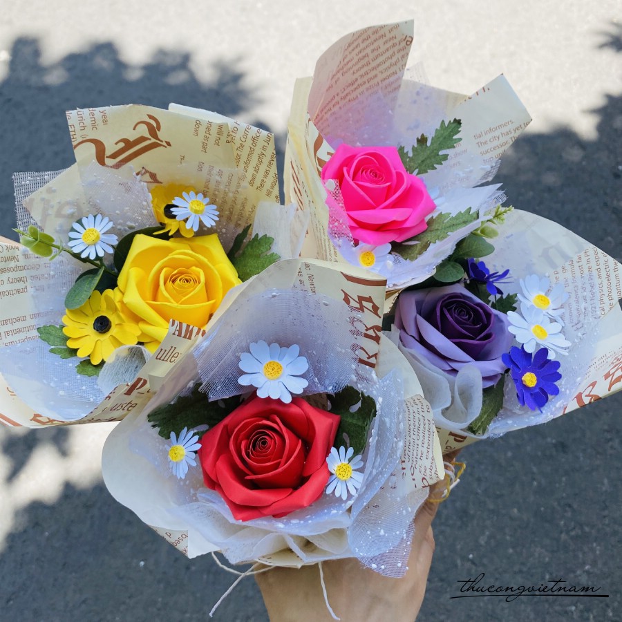 Bó hoa hồng giấy 1 bông xinh xắn có 4 màu: vàng, đỏ, tím, hồng.