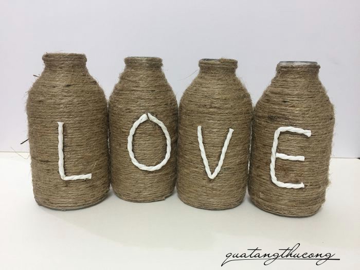 Bộ lọ thủy tinh được tạo phong cách riêng bằng cách quấn dây, và trang trí theo chủ đề chữ LOVE.