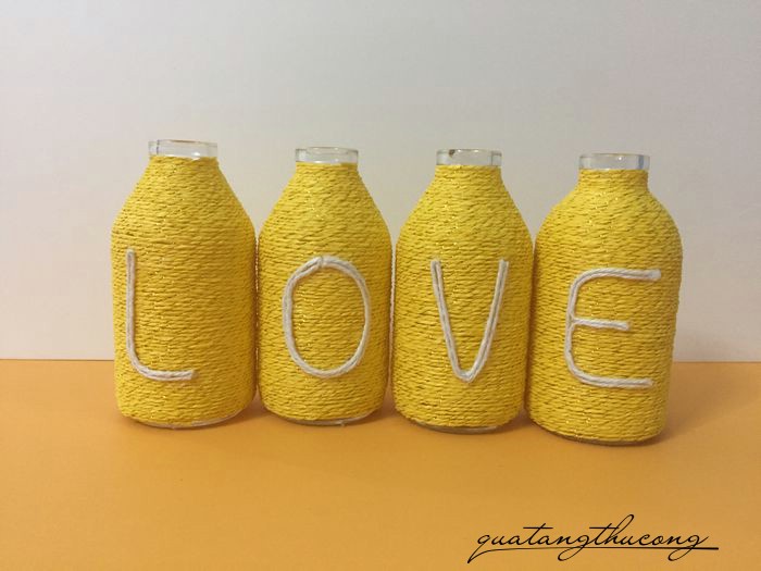 Bộ lọ thủy tinh được tạo phong cách riêng bằng cách quấn dây, và trang trí theo chủ đề chữ LOVE.