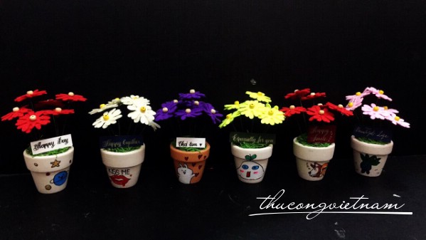 Hoa cúc được cắt từ vải nỉ với nhiều màu sắc đỏ, tím, vàng, hồng, trắng,... Chậu cắm hoa được vẽ trang trí bằng những hình xinh xắn.