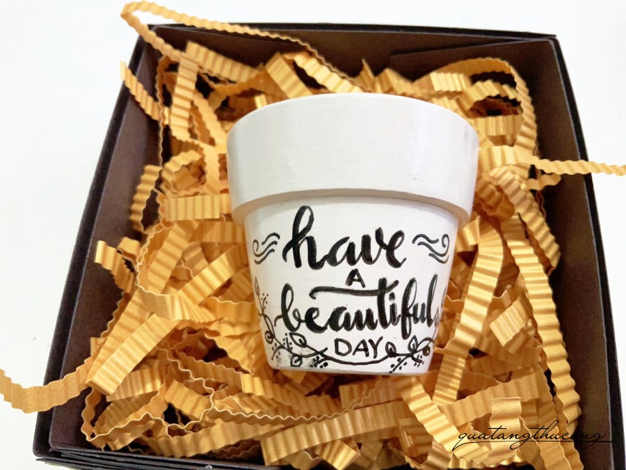 Chậu có kích thước là 5.5cm, đã trang trí giá 20.000 VND/chậu (giá không bao gồm hộp và rơm giấy).