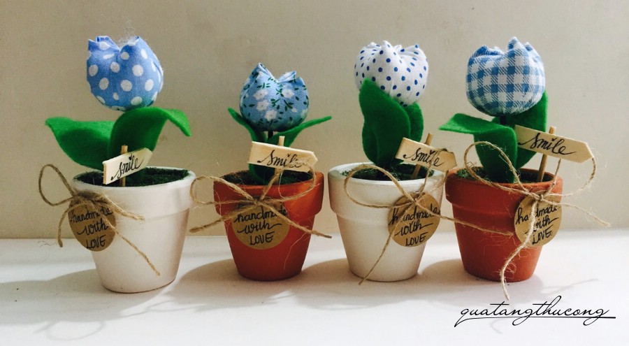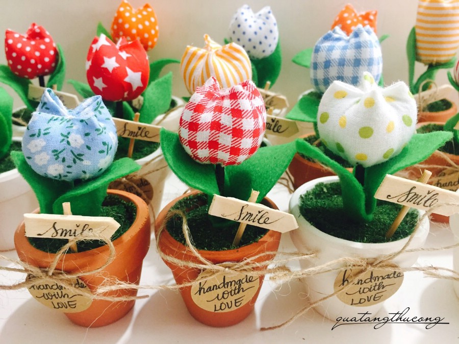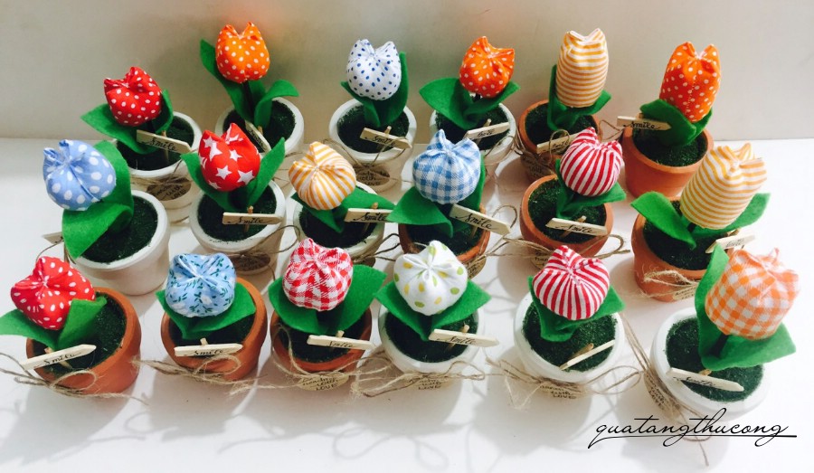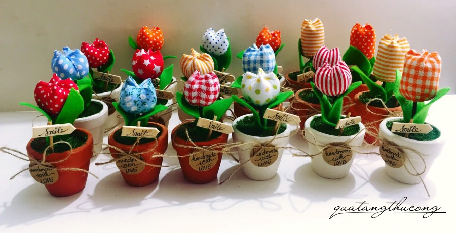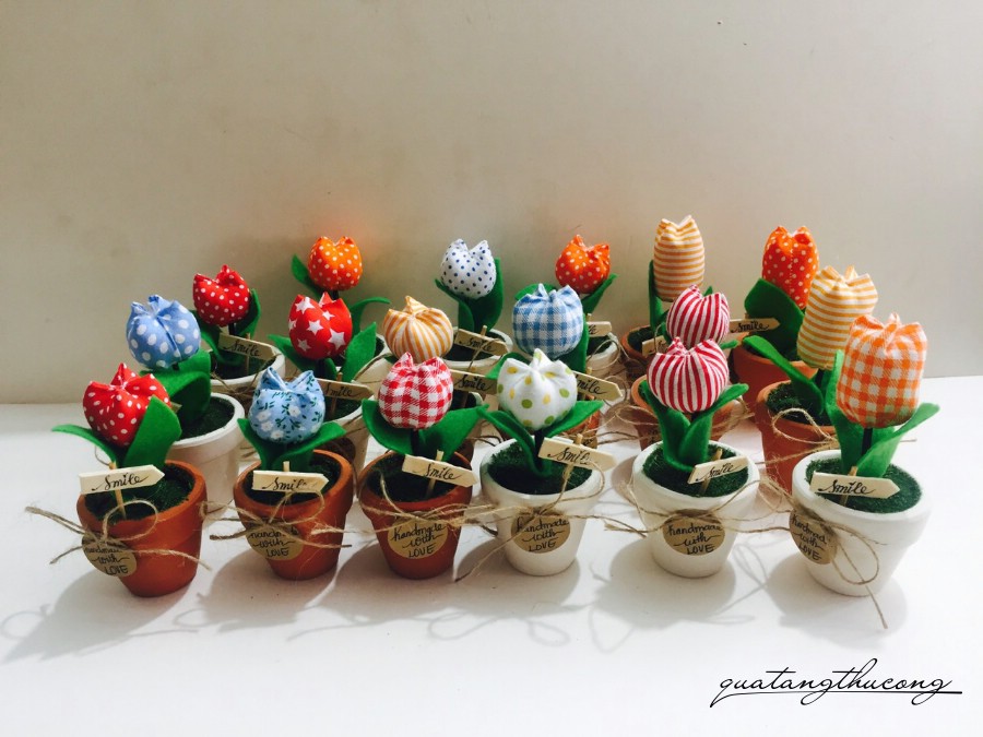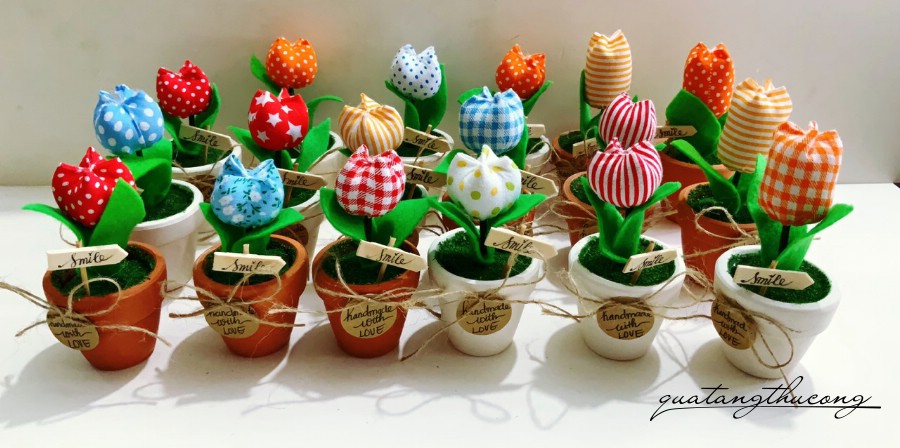 Hoa Tulip được may bằng vải nhiều màu sắc, cắm trong chậu đất nung, kích thước chậu 5cm, tag ghi thông điệp.