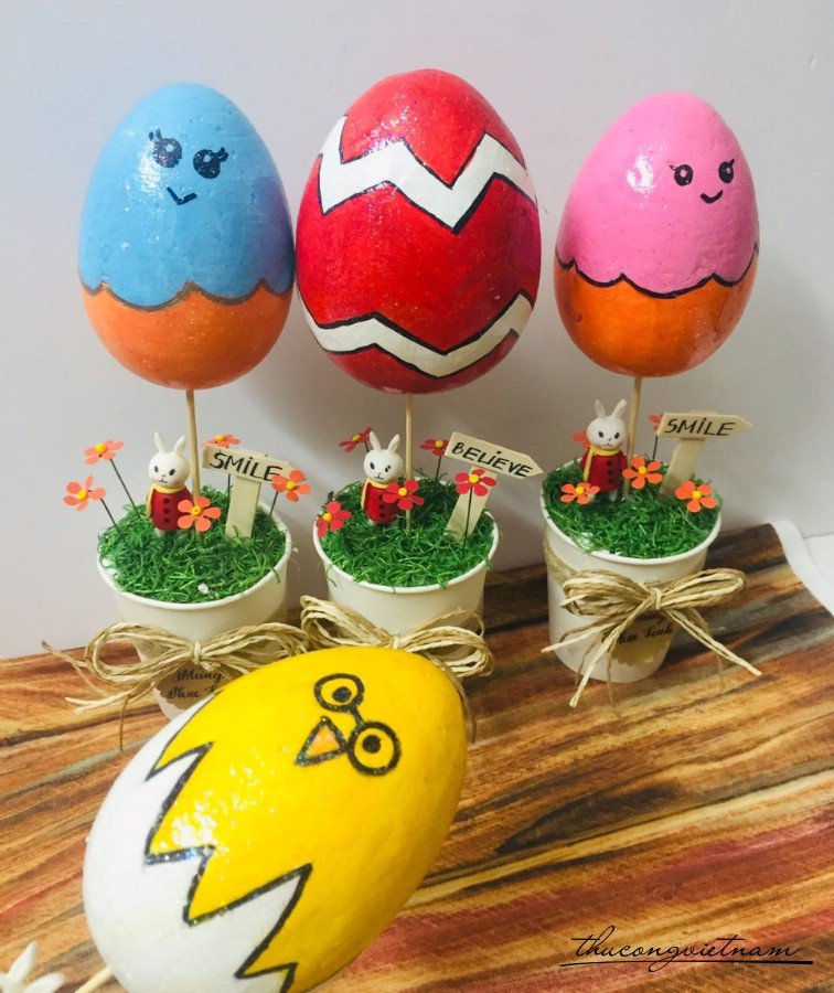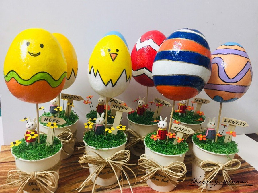 Những quả trứng đến từ Vinacraft được làm bằng xốp nguyên khối, những quả trứng được trang trí bằng các họa tiết nhiều màu sắc.