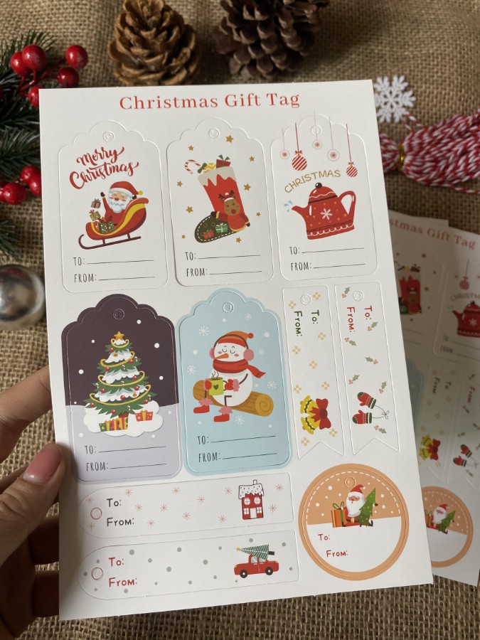 Tag giấy trang trí chủ đề giáng sinh, có nhiều hình cho bạn lựa chọn. Bạn có thể mua về để cột lên các cây thông, hay những món quà dành tặng cho người thân yêu của mình.