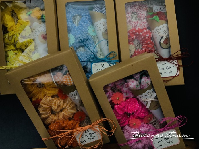 Chúng tớ còn có hộp Scrunchies được phối theo tông màu kèm bó hoa và các vật phẩm trang trí đi kèm. May hoàn toàn thủ công.