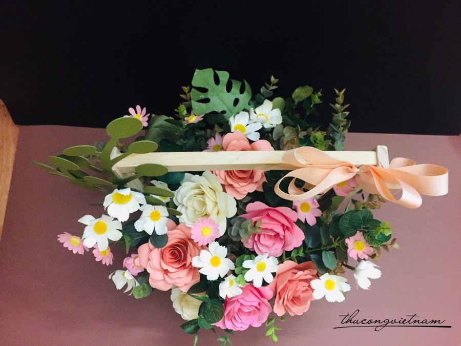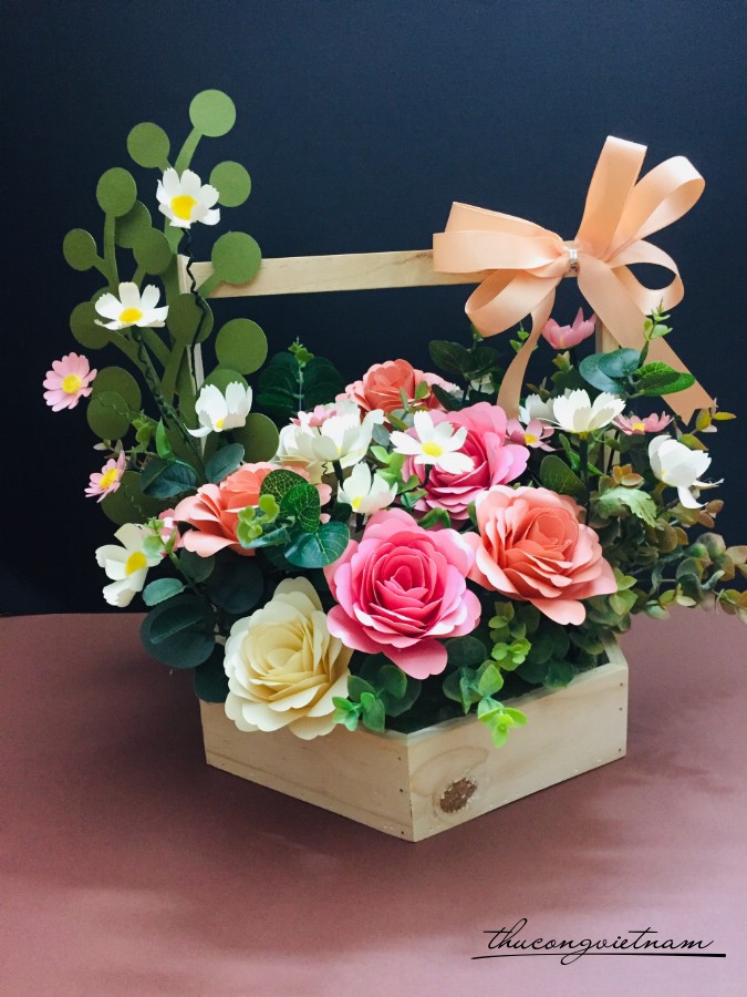 Giỏ hoa hỗn hợp quai gỗ màu hồng