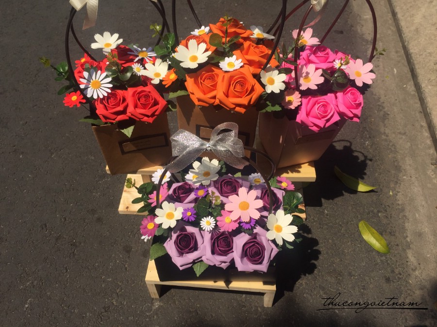 Những giỏ hoa từ giấy mỹ thuật đã quá quen thuộc tại Vinacraft rồi. Tuy nhiên thì không hề nhàm chán vì có rất nhiều loại hoa: hoa hồng, hoa sao nhái, cúc 14 cánh... và được làm từ nhiều màu sắc rất sống động.