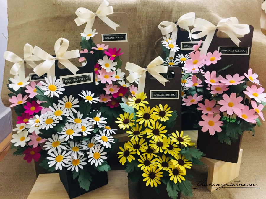 Những giỏ hoa từ giấy mỹ thuật đã quá quen thuộc tại Vinacraft rồi. Tuy nhiên thì không hề nhàm chán vì có rất nhiều loại hoa: hoa hồng, hoa sao nhái, cúc 14 cánh... và được làm từ nhiều màu sắc rất sống động.