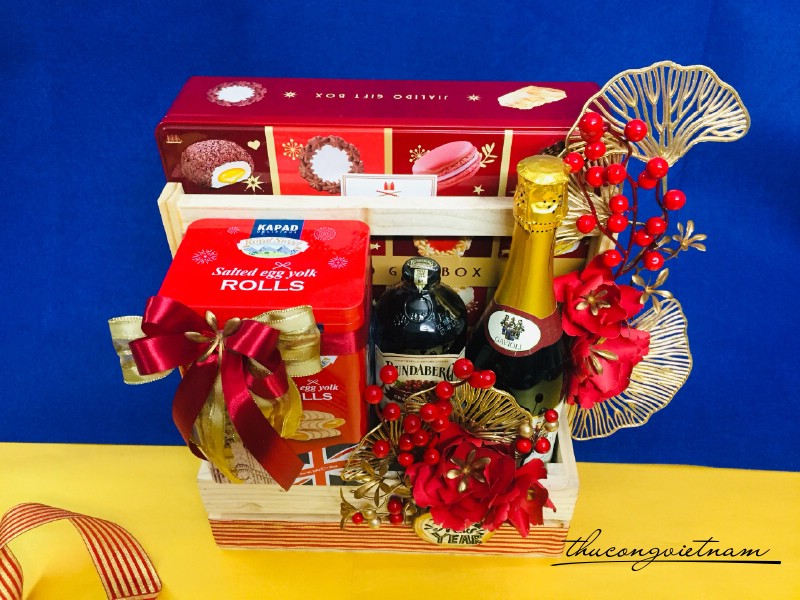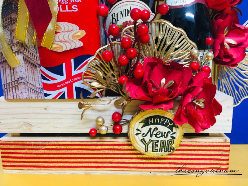 Tông màu đỏ truyển thống cho ngày Tết được trang trí bởi những bông hoa giấy thủ công, điểm thêm những quả đỏ, lá nhũ vàng. Tất cả tổ hợp quà bánh được đặt trong 1 chiếc giỏ gỗ có quai xách tiện lợi. Nhấn nhá thêm 1 khoanh gỗ viết tay chữ Happy New Year.