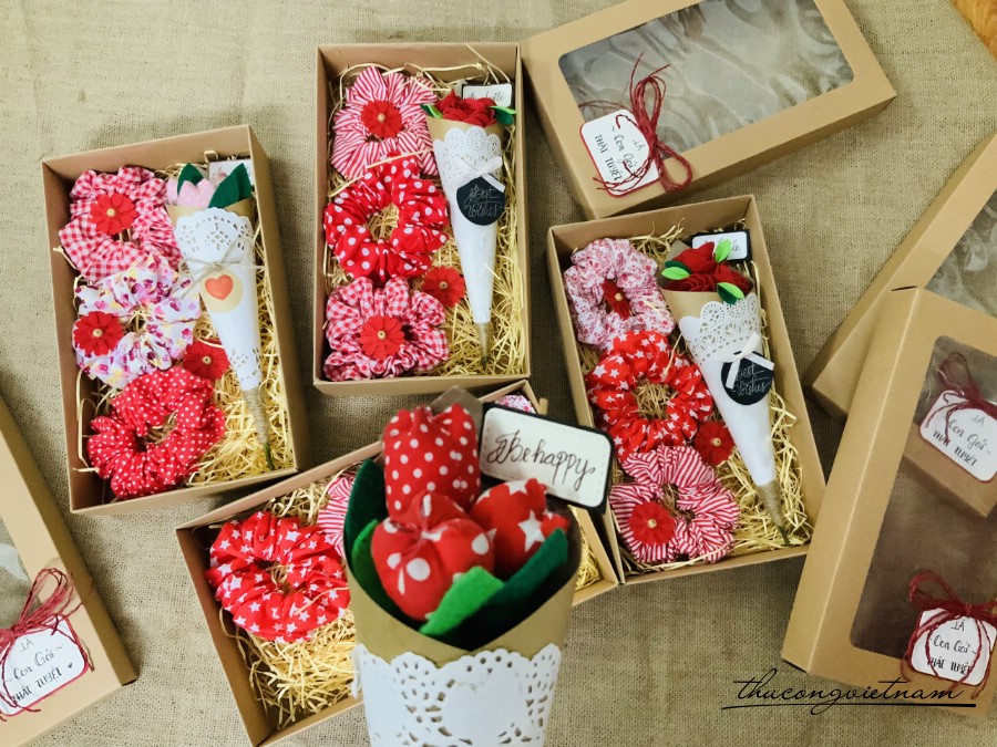 Hộp được phối theo tông màu kèm bó hoa và các vật phẩm trang trí đi kèm. May hoàn toàn thủ công.