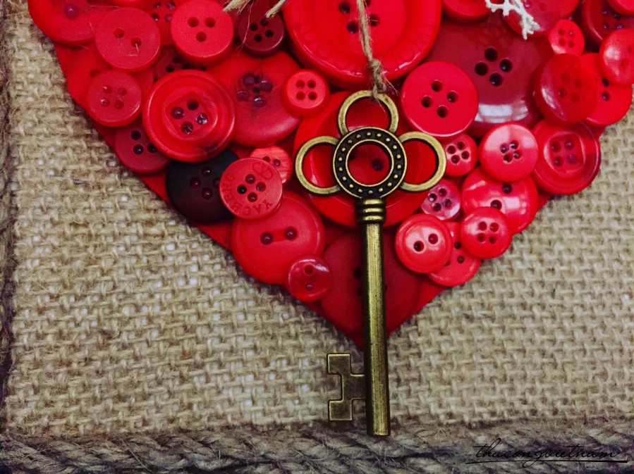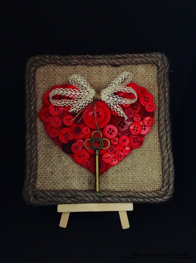 Mẫu khung vải bổ có hình trái tim đỏ được đắp bằng hạt nút, thêm chút nơ và một chiếc chìa khóa đồng "mở cửa trái tim".