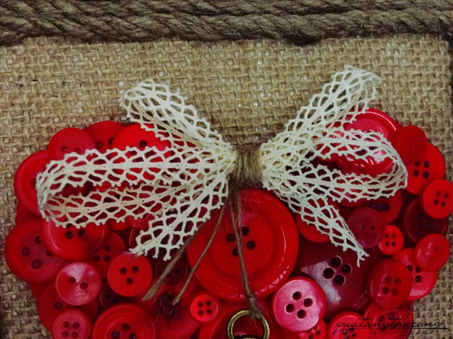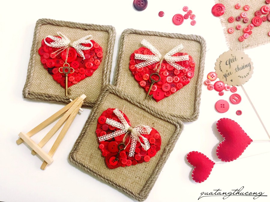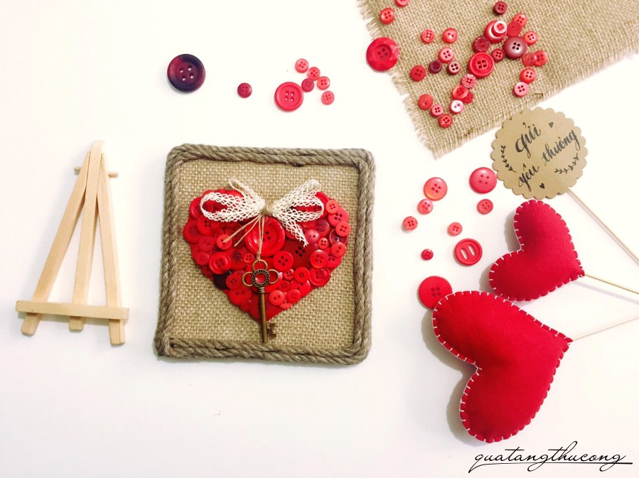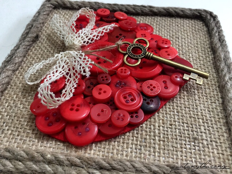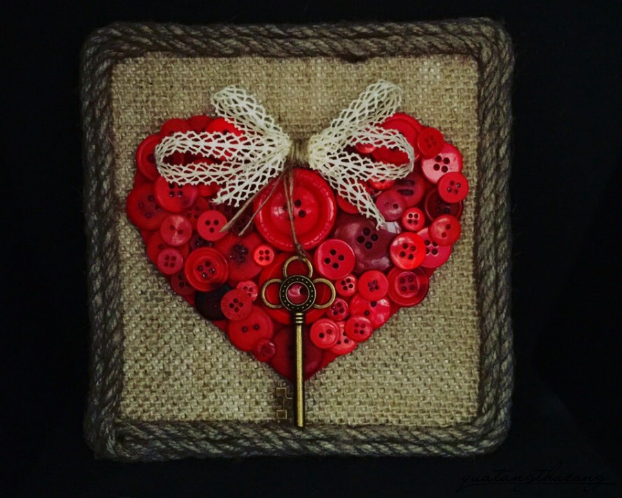 Mẫu khung vải bổ có hình trái tim đỏ được đắp bằng hạt nút, thêm chút nơ và một chiếc chìa khóa đồng "mở cửa trái tim".
