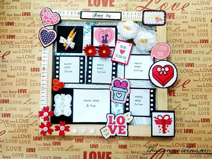 Được trang trí với hoa giấy, mẫu bút chì, các sticker tình yêu, viền khung còn đính ruy băng nữa nhé!