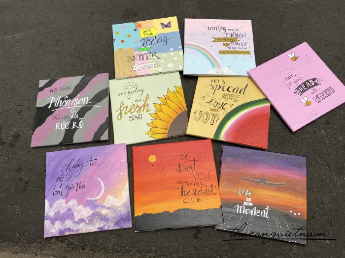 Chất liệu khung tranh vải bố trắng, được VNC vẽ hoàn toàn thủ công bằng màu AC, chữ cũng được các bạn viết theo nhiều phong cách khác nhau để phù hợp hơn với từng chủ để.