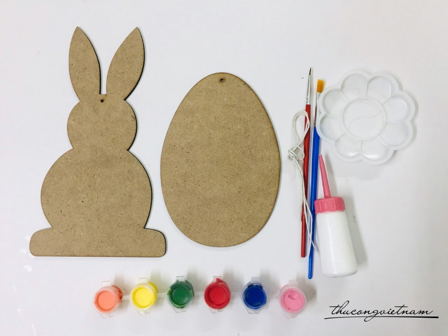 Kit trang trí Thỏ và Trứng bằng gỗ bao gồm: 01 thỏ gỗ 20cm có lỗ treo; 01 trứng gỗ 15cm có lỗ treo; 01 cọ dẹp và 01 cọ nhọn; 01 khay pha màu; 01 hủ lớn màu trắng; 06 hủ nhỏ màu khác nhau; 1m dây cột; giấy hướng dẫn và mẫu gợi ý.