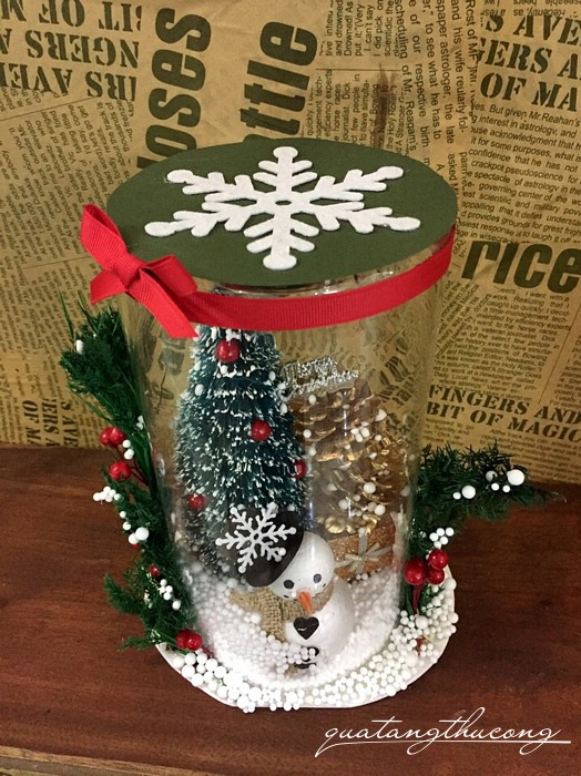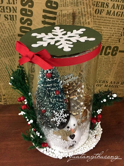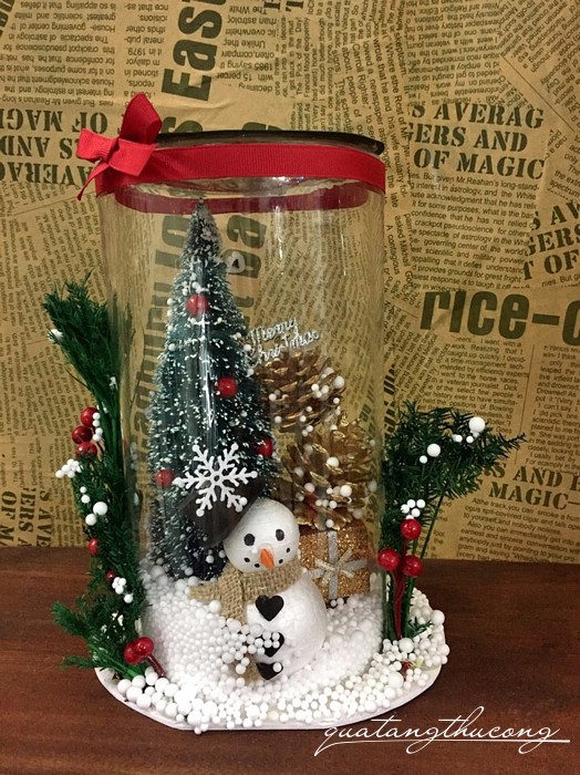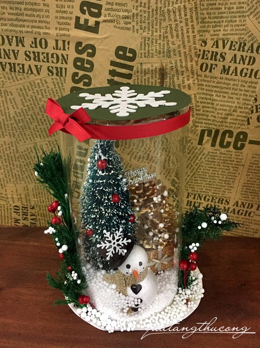 Trong lọ là những phụ liệu đặc trưng của giáng sinh: cây thông, người tuyết, quả thông....