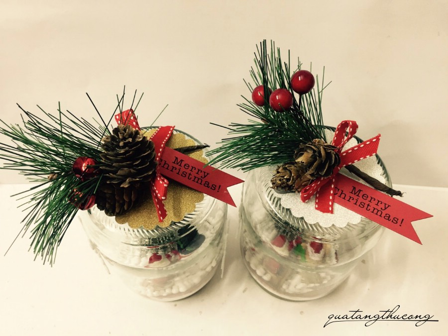 Bên trong lọ là các mô hình xinh xinh, ngoài ra còn được điểm thêm ruy băng, quả thông khô,... tất cả các nguyên vật liệu có sẵn tại Vinacraft nhé!