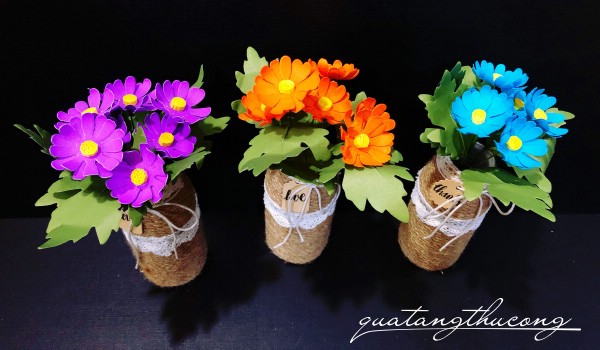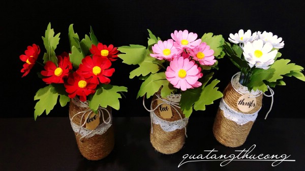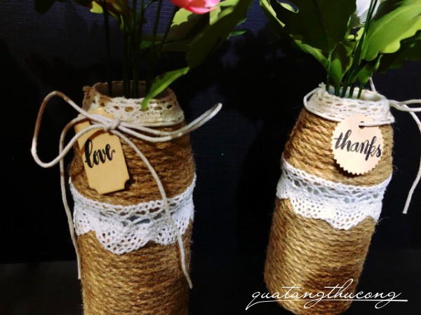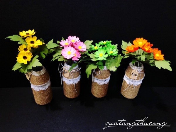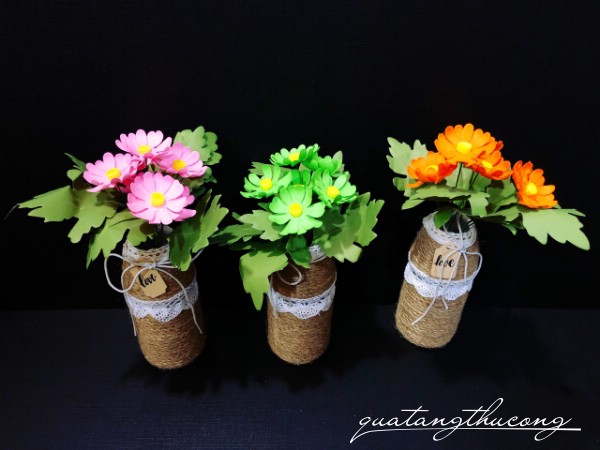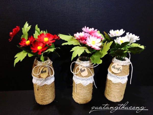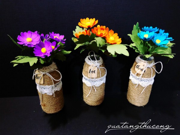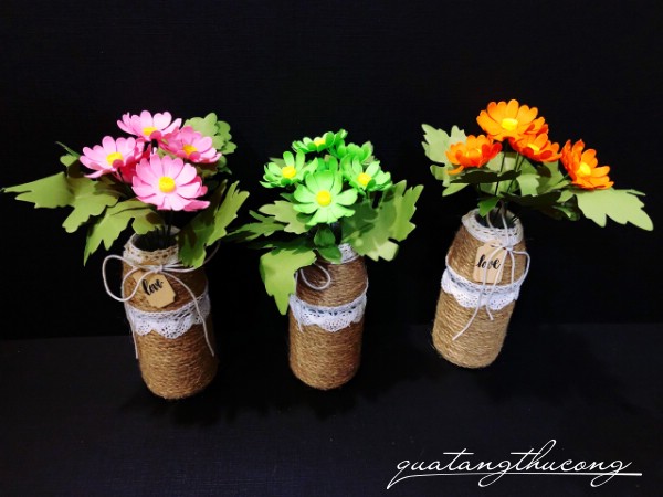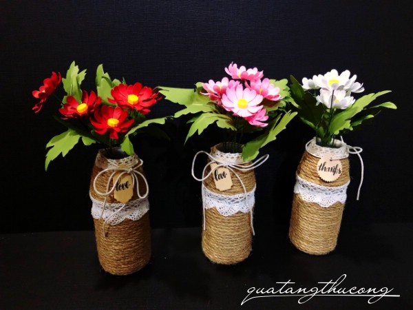 Lọ hoa thủy tinh quấn dây thừng, bọc vải bố, trang trí tag, dây cột nơ cắm hoa cúc màu giá chỉ 85k.