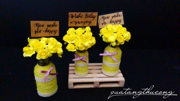 Hoa hồng giấy thái, những bông hoa nhỏ xinh cắm trong chiếc lọ thủy tinh quấn giấy bên ngoài, điểm thêm nơ ruy băng, dây ren. Thêm chút thông điệp tên tag giấy cắm vào lọ, truyền tải những yêu thương dành tặng cho những nhiều thân yêu.