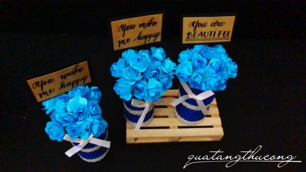 Hoa hồng giấy thái, những bông hoa nhỏ xinh cắm trong chiếc lọ thủy tinh quấn giấy bên ngoài, điểm thêm nơ ruy băng, dây ren. Thêm chút thông điệp tên tag giấy cắm vào lọ, truyền tải những yêu thương dành tặng cho những nhiều thân yêu.