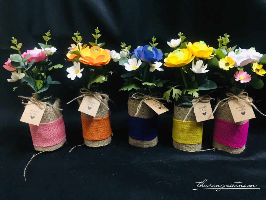 Bình cắm hoa bằng thủy tinh được trang trí dây ren, dây cột, thông điệp,...