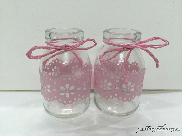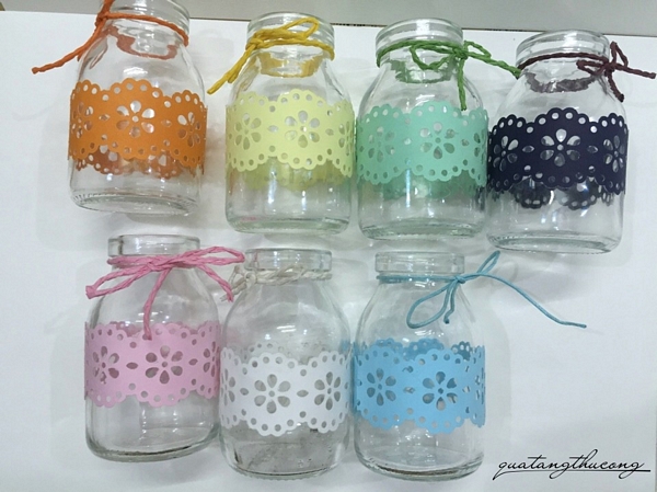 Lọ thủy tinh đơn giản được trang trí thêm tag giấy, ruy băng, ren giấy... trở nên nổi bật hơn hẳn.
