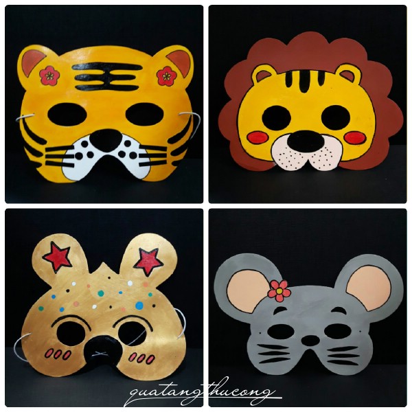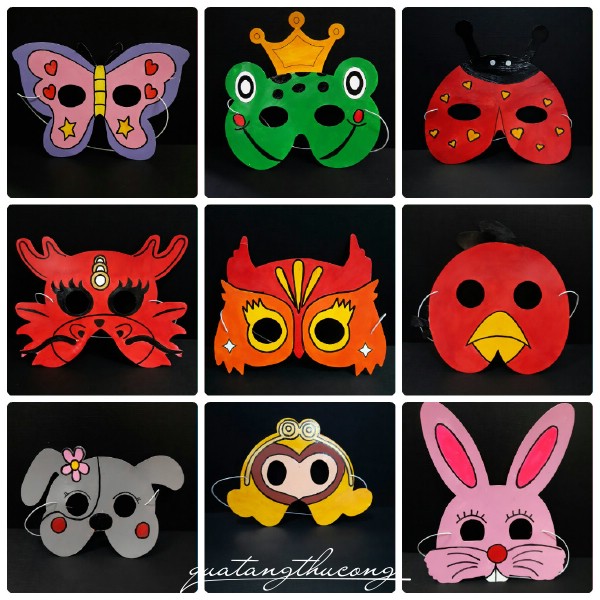 Mặt nạ giấy hình thú đã trang trí, được tô vẽ nhiều màu sắc. Có nhiều hình con hồ, sư tử, bươm bướm, thỏ, ếch, khỉ, chó, chuột,…