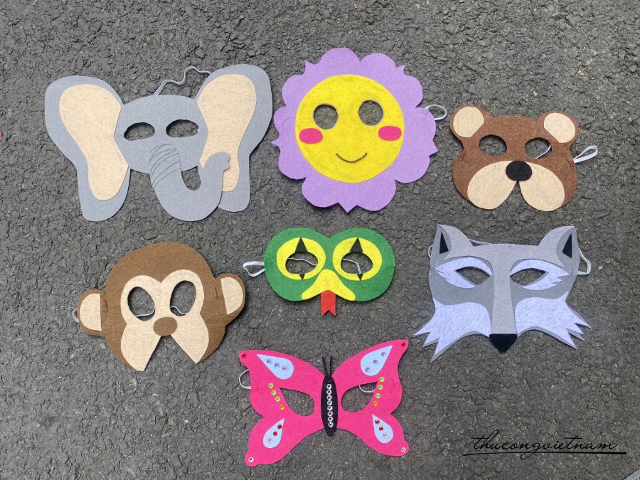 Mặt nạ hóa trang làm bằng vải nỉ. Có nhiều hình cho bạn lựa chọn: con mèo, cáo, sóc, thỏ, chuột, gấu, nhím, nai, cú mèo, cướp biển, bí ngô, xác ướp, dơi, sư tử, cọp, ngựa vằn, voi, hươu,...
