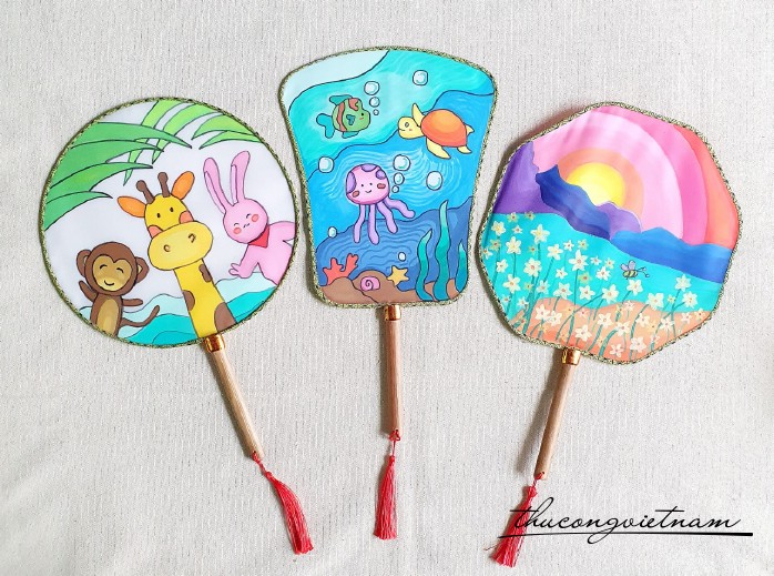 Quạt có chất liệu vải trắng khung sắt bọc vải. Tay cầm cán gỗ hoặc nhựa