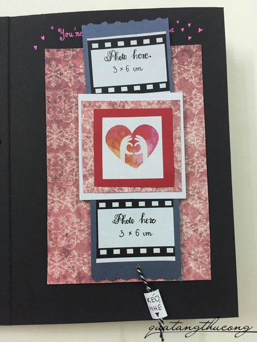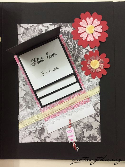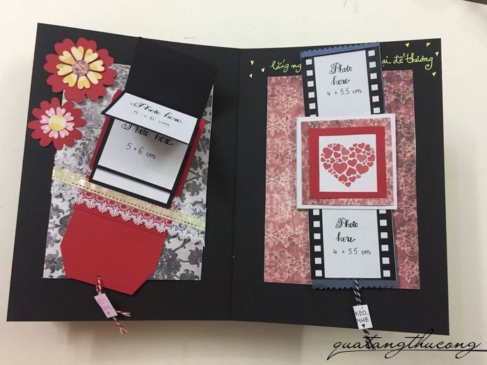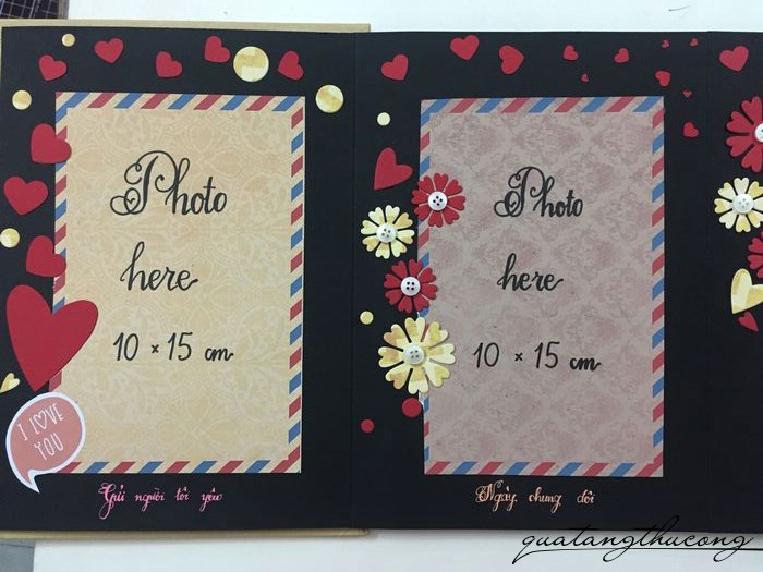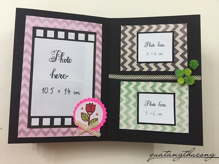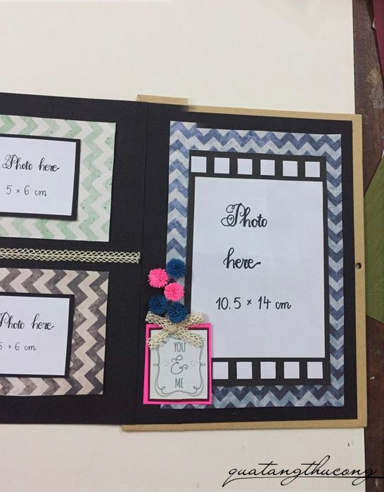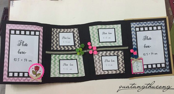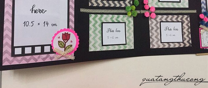 Quyển scrapbook với nhiều khung ảnh nhỏ, kích thước khác nhau 5x6cm, 8x9cm, 10.5x14cm...., gợi ý cho bạn dán ảnh