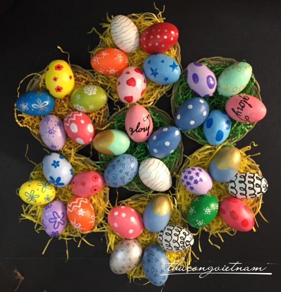 Những quả trứng đến từ Vinacraft được làm bằng xốp nguyên khối, những quả trứng được trang trí bằng các họa tiết nhiều màu sắc.