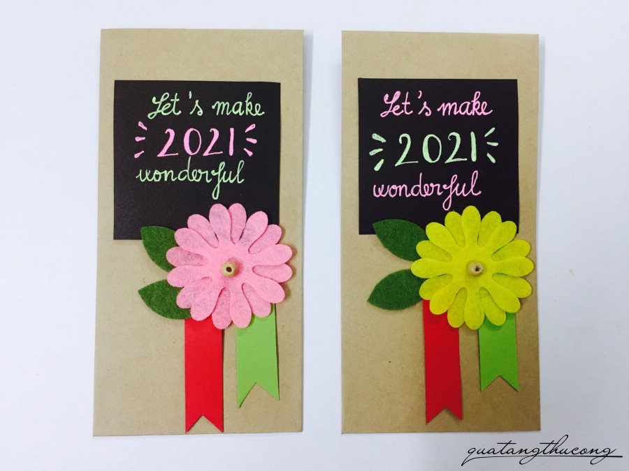 Bao lì xì Handmade được trang trí bằng giấy quilling tạo thành những bông hoa, chiếc lá, ngoài ra còn có hoa lá vải nỉ và nhiều nguyên vật liệu khác...