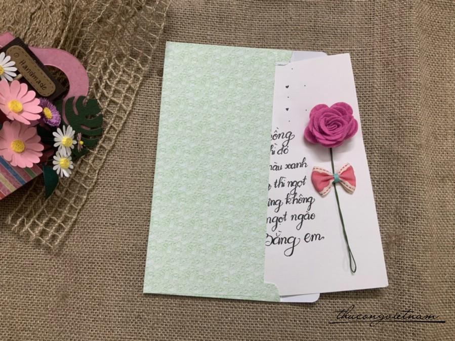 Bên ngoài tấm thiệp được chúng tớ tỉ mỉ dán lên một bông hoa hồng vải nỉ đính kèm một chiếc nơ xinh xắn.