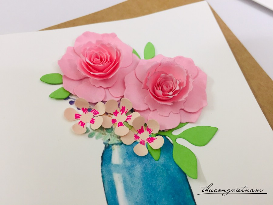 Thiệp được trang trí làm nổi bật họa tiết với cách quấn giấy quilling.
