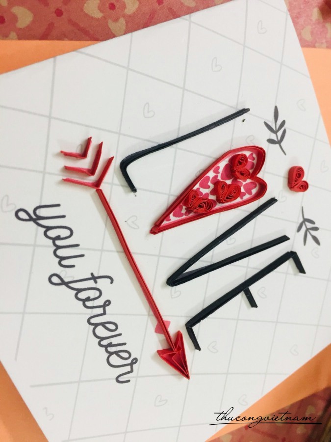 Quilling được quấn tỉ mỉ thành hình những chú chim, bông hoa, các cặp đôi,... làm cho tấm thiệp đặc sắc hơn.
