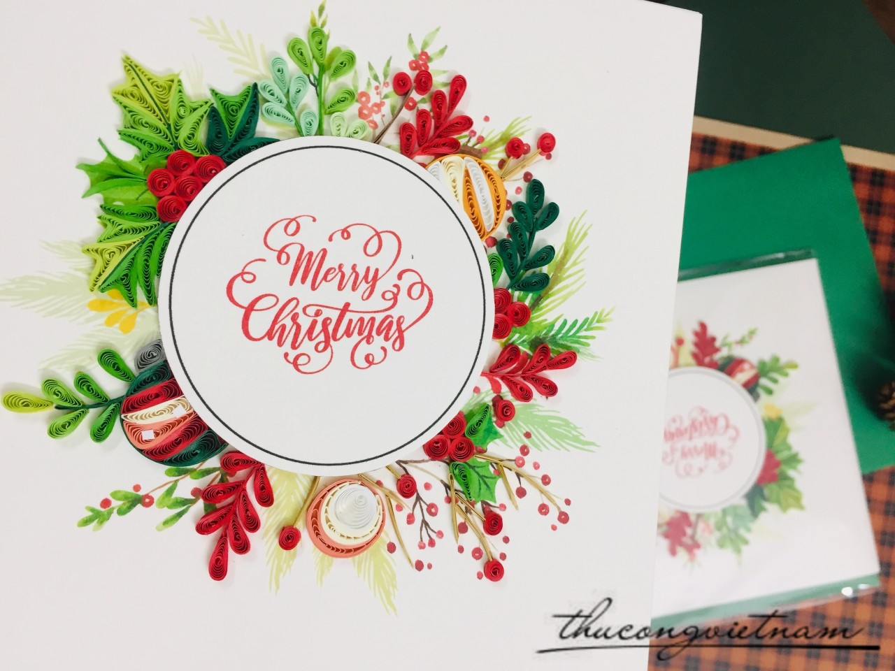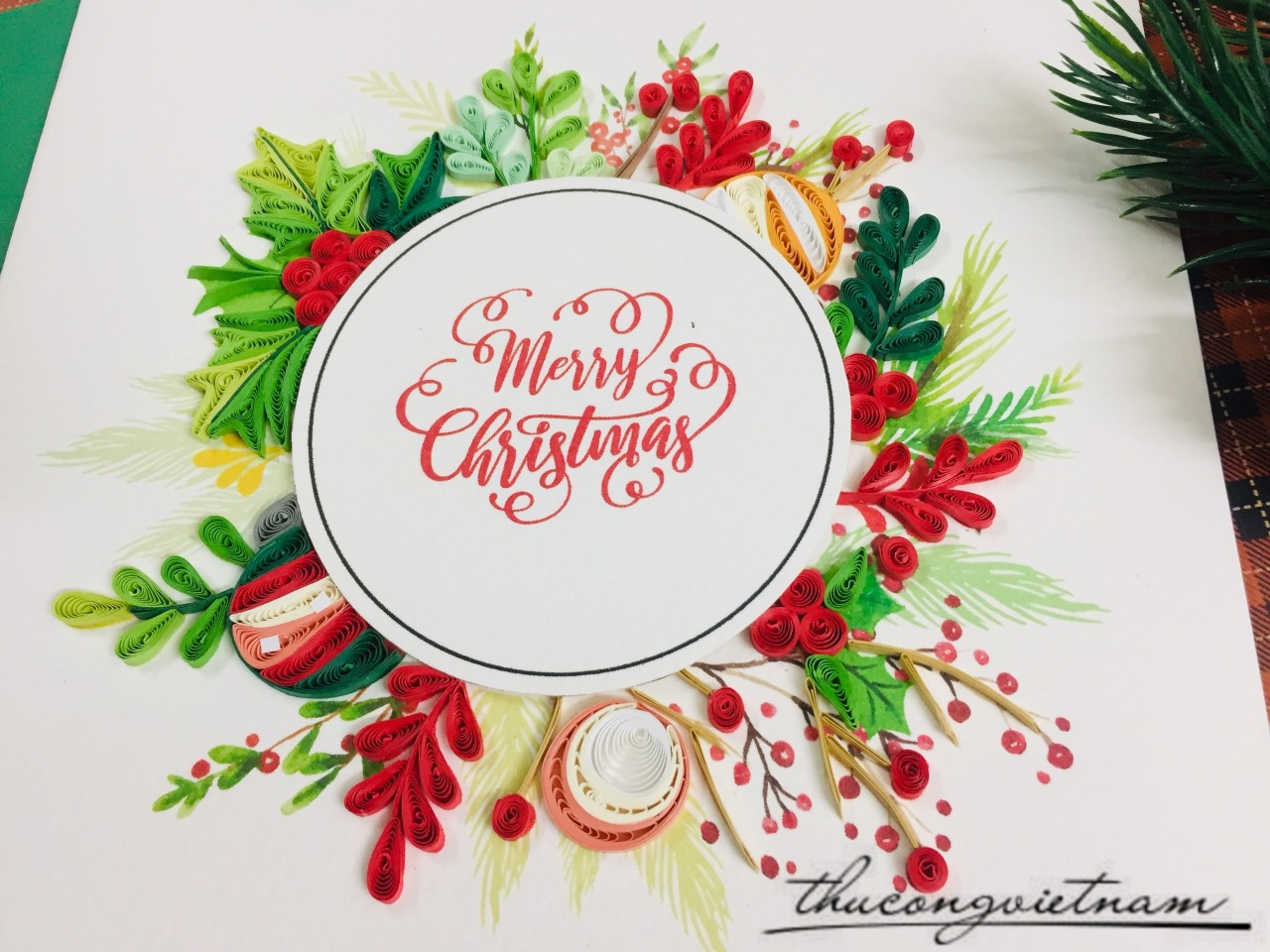Mẫu thiệp giáng sinh này nổi bật với những họa tiết được quấn giấy quilling, không cầu kì nhưng đẹp mắt và nổi bật.