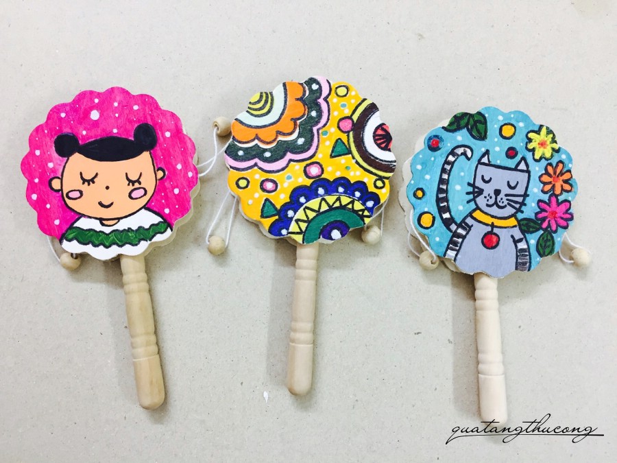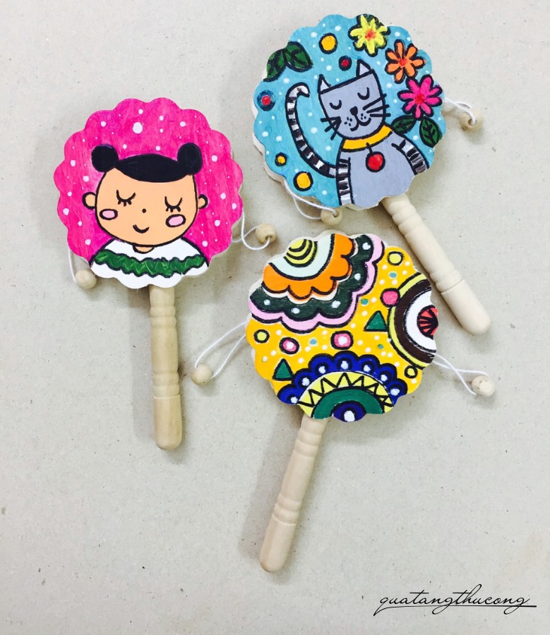 Trống lắc tay bằng gỗ được trang trí tô vẽ hình sống động, dùng để trang trí, làm đồ chơi cho các bé và nhiều công dụng khác,...