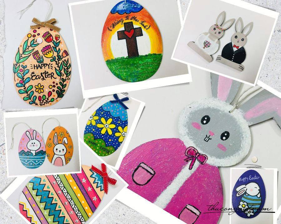 Foam gỗ ép hình quả trứng được vẽ tay, trang trí nhiều kiểu khác nhau.