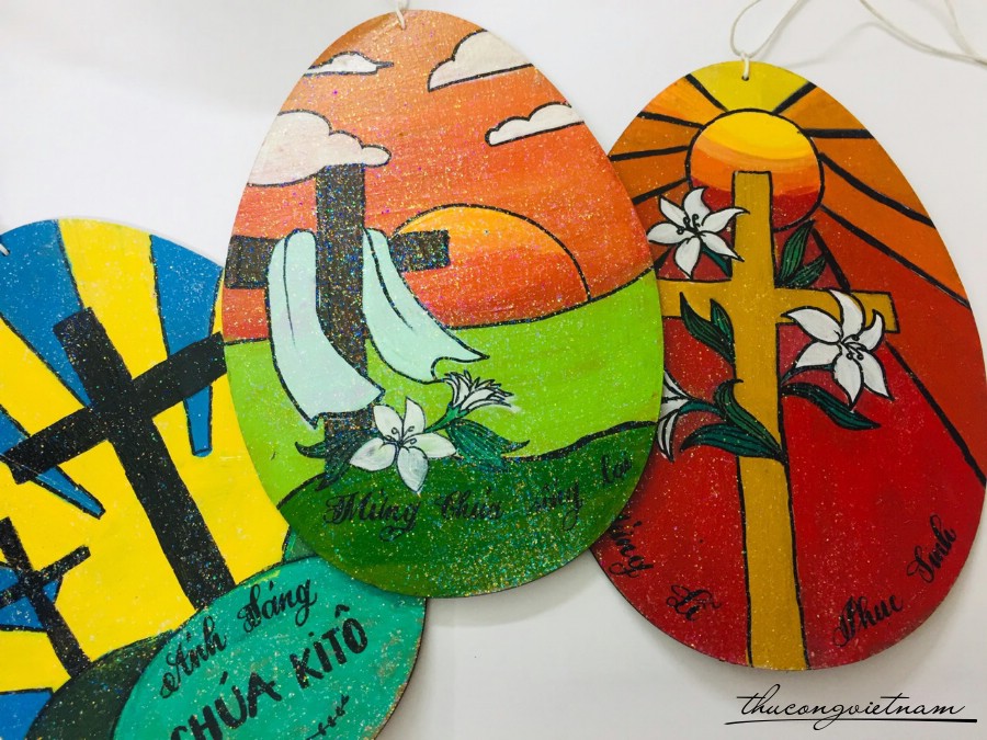 Foam gỗ ép hình quả trứng được vẽ tay, trang trí nhiều kiểu khác nhau.