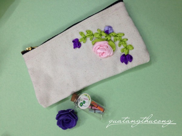 Ví vải bố được trang trí những bông hoa thêu bằng ruy băng rất là xinh xắn.