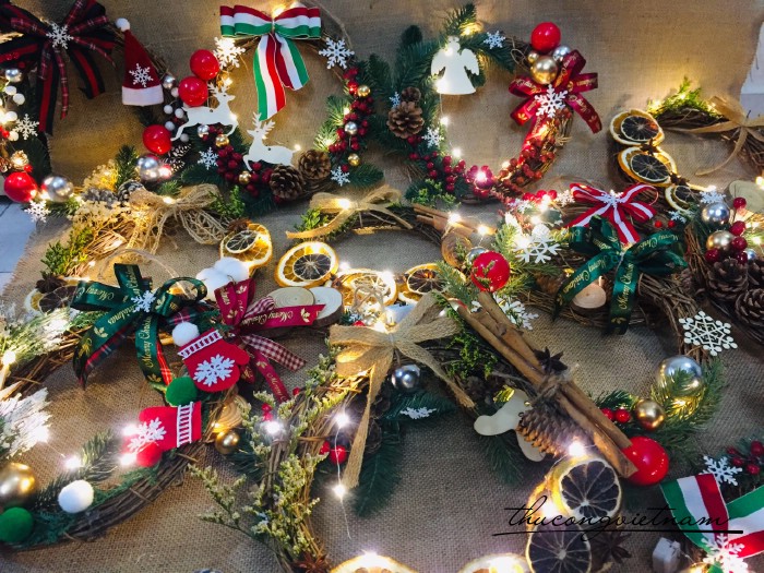 Vòng cỏ treo giáng sinh được làm từ những loại dây ruy băng Châu Âu cao cấp, giấy mỹ thuật và được trang trí thêm búp bê, hoa tuyết, hoa nỉ,...