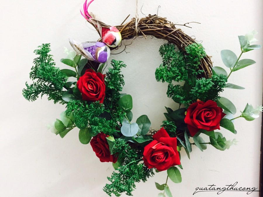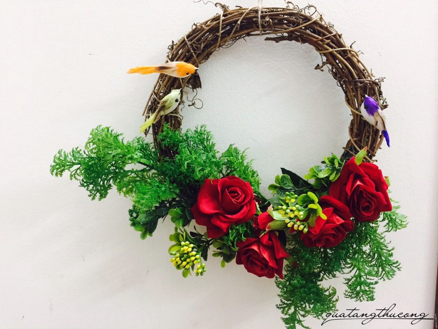 Vòng hoa cỏ khô được trang trí hoa hồng, lá, chim chóc,...