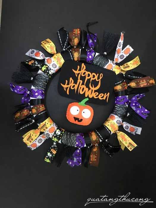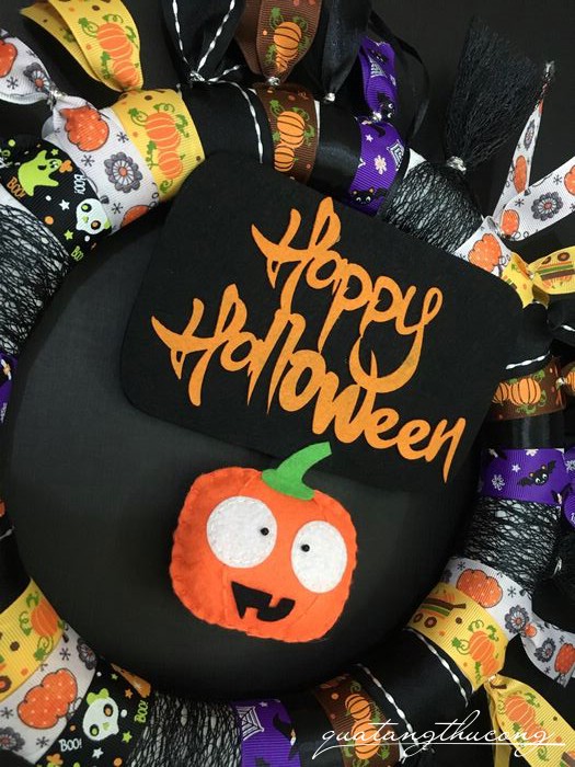 Chính giữa là dòng chữ Happy Halloween và phụ kiện vải nỉ bí ngô được may thủ công nhe.