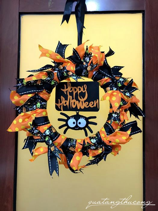 Chính giữa là dòng chữ Happy Halloween và phụ kiện vải nỉ con nhện được may thủ công nhe.