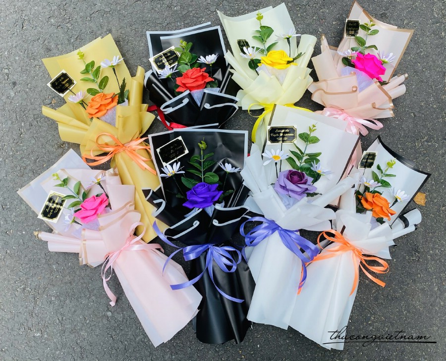 Bó hoa hồng giấy 1 bông xinh xắn có thêm màu hồng, đỏ,tím ngoài các màu vàng, cam nhạt, cam đậm, xanh dương, xanh da trời.