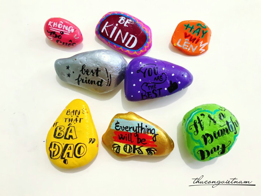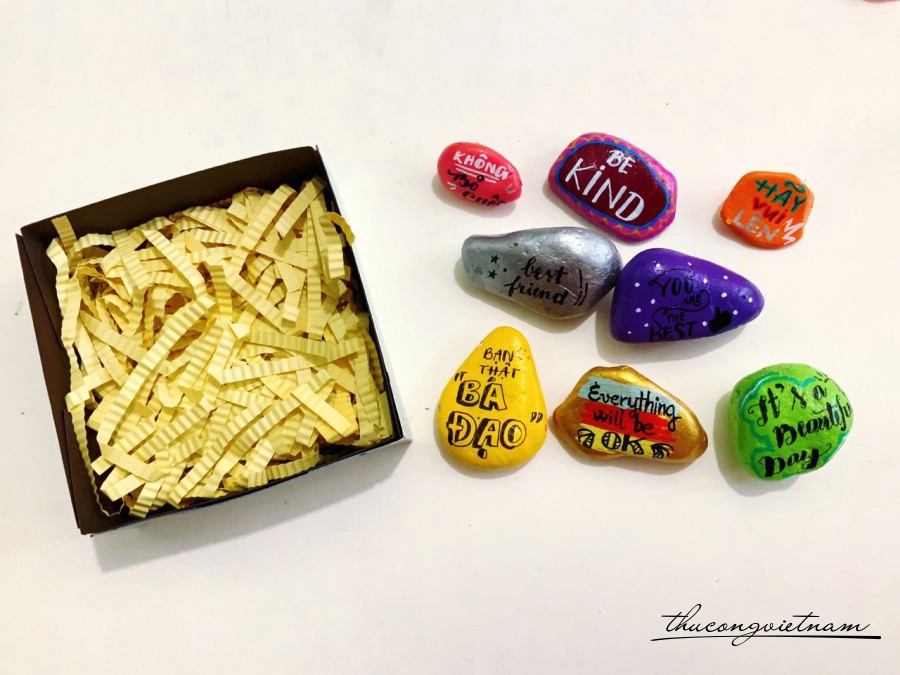 Set những viên đá với mỗi viên mang những thông điệp khác nhau cùng với cách trang trí tô vẽ màu sắc khác nhau tạo nên sự sinh động khi mở hộp quà.