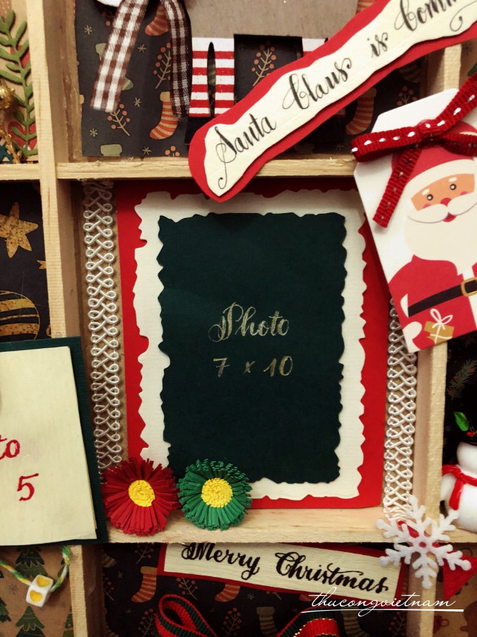Khung gồm 9 ô, mỗi ô được trang trí khác nhau với những nguyên vật liệu như kẹp gỗ, hoa tuyết nỉ, cây thông, mô hình người tuyết, tuần lộc,... được kết hợp với nhau mang không khí giáng sinh đến ngay bên bạn.